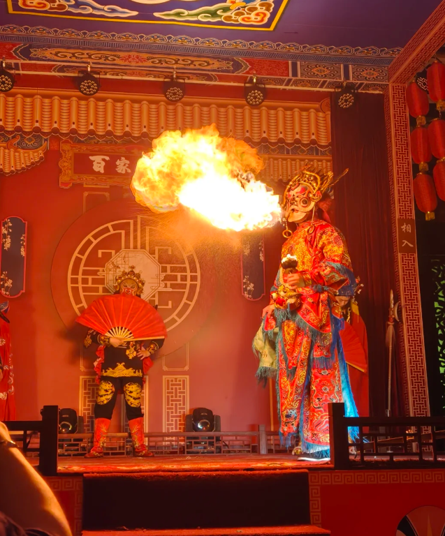 四川オペラ(シューフェン雅韻劇場)では「顔変わり」「火吹き」など非物質文化遺産の技を鑑賞(20:00〜21:30)
